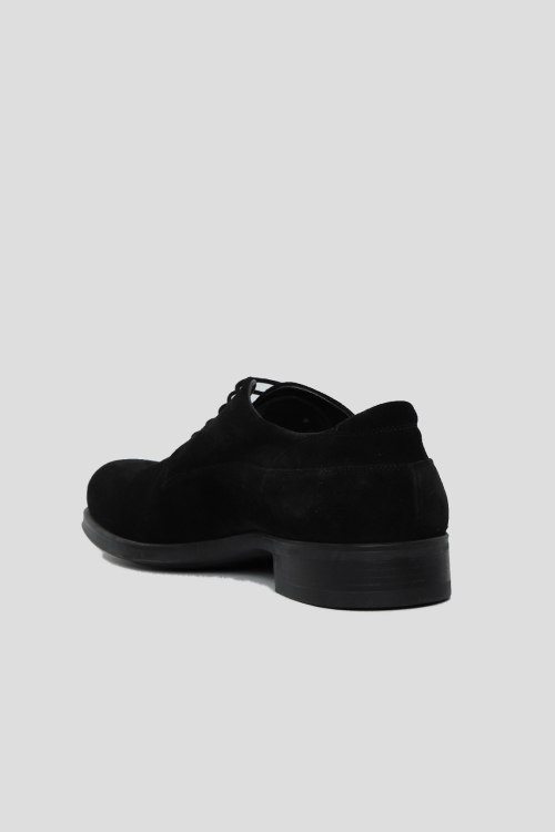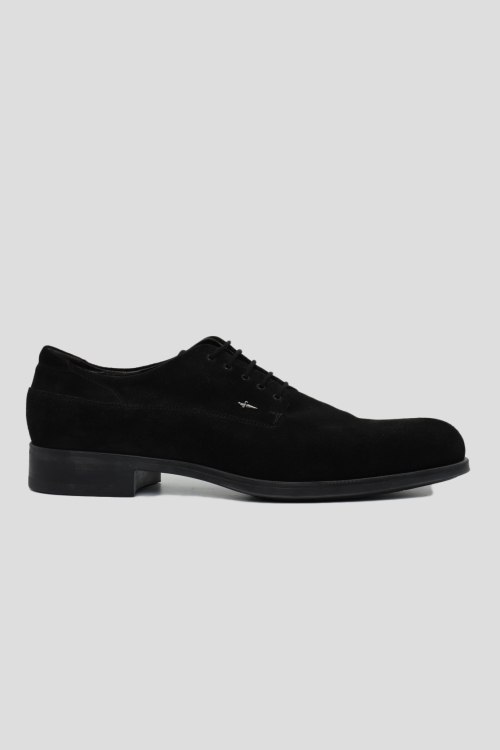 Мужские черные туфли из натуральной замши от Cesare Paciotti (Чезаре Пачиотти). Металлический логотип, классическая шнуровка, миндалевидный носок, широкий каблук, плоская подошва