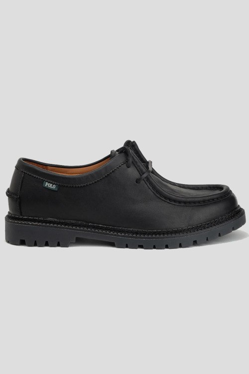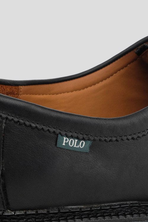 Детали: Мужские черные кожаные туфли от Ralph Lauren (Ральф Лорен). Модель из гладкой кожи, нашивка с логотипом сбоку, тиснение логотипа на язычке, шнуровка, закругленный носок, кожаная стелька