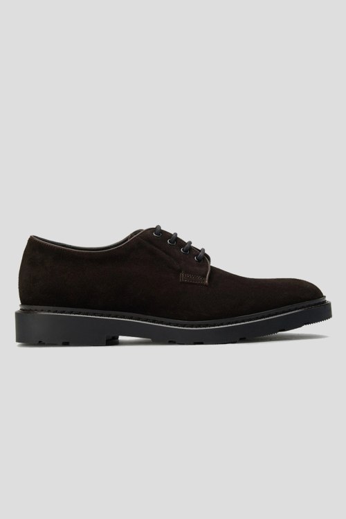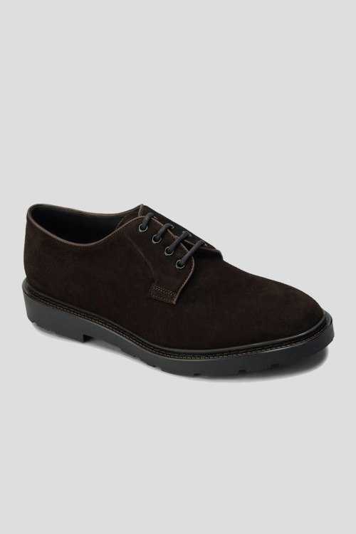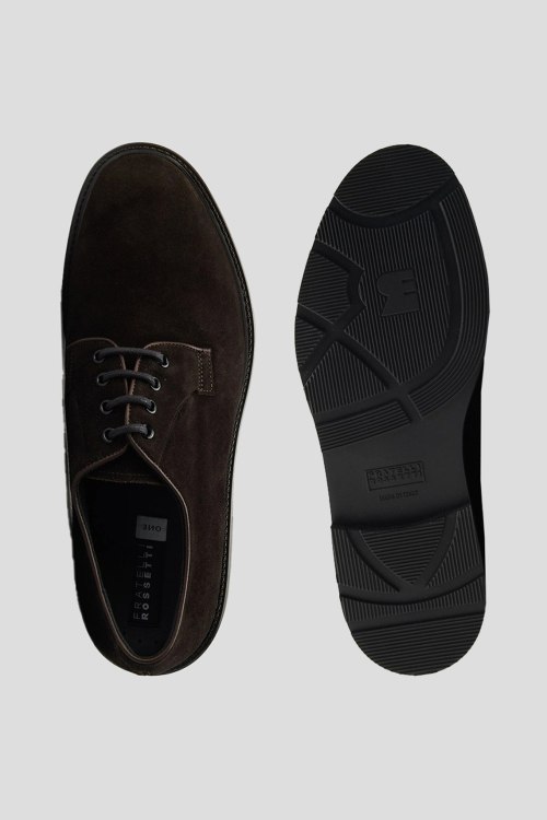 Детали: Мужские темно-коричневые замшевые дерби от Fratelli Rossetti (Фрателли Роззетти). Классическая шнуровка, закругленный носок, стелька с логотипом