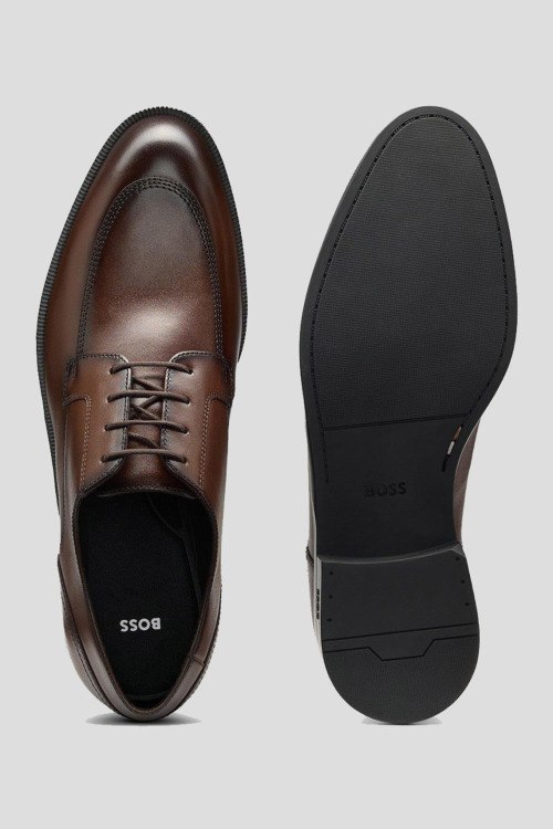 Детали: Мужские коричневые кожаные дерби Tayil от Hugo Boss (Хуго Босс). Модель из гладкой кожи, классическая шнуровка, миндалевидный носок, кожаная стелька