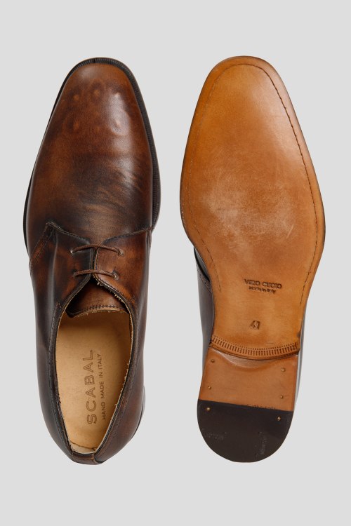 Детали: Мужские коричневые кожаные туфли от Scabal (Скабал). Модель из гладкой кожи, дизайн с градиентом, классическая шнуровка, миндалевидный носок, блочный каблук, кожаная стелька с логотипом