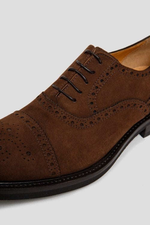 Детали: Мужские коричневые броги из натуральной замши от Scabal (Скабал). Миндалевидный носок, закрытая шнуровка, дизайн с перфорацией, блочный каблук, кожаная стелька с логотипом бренда