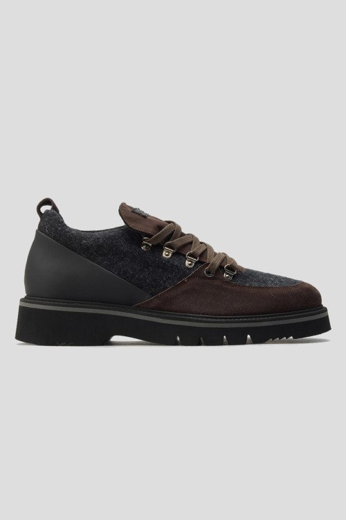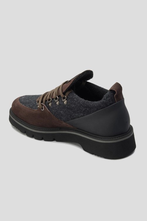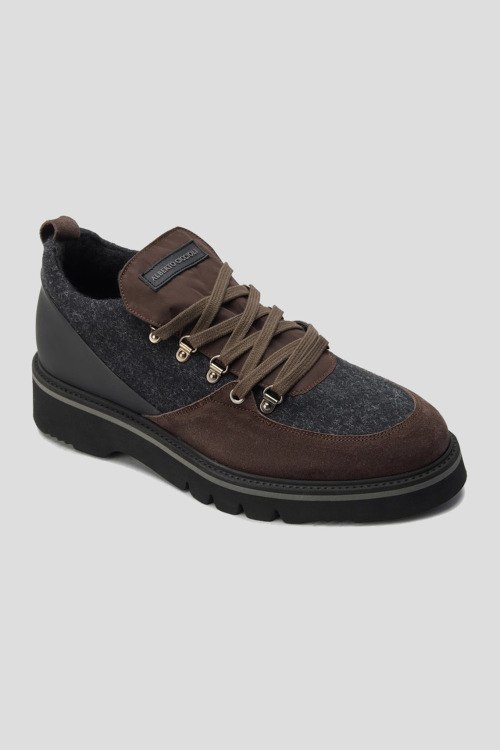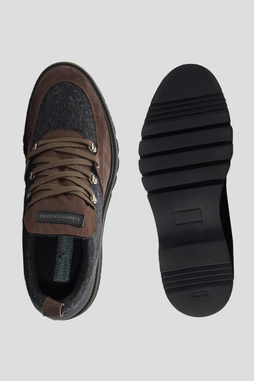 Детали: Мужские серо-коричневые туфли из текстиля и замши от Alberto Ciccioli (Альберто Чичиоли). Комбинация цветов и материалов, логотип на язычке, классическая шнуровка, петля для подтягивания сзади, закругленный носок, текстильная стелька