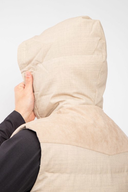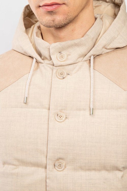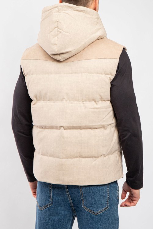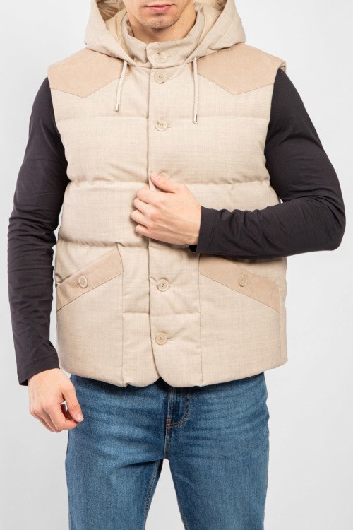 Детали: Мужской бежевый шерстяной жилет на пуху от Panicale Cashmere (Паникале Кашемир). Стеганый дизайн, вшитый капюшон, высокий воротник, передние карманы, застежка на пуговицы, классическая длина, наполнитель из микса пуха и пера. Размер вещи на фото: 52
