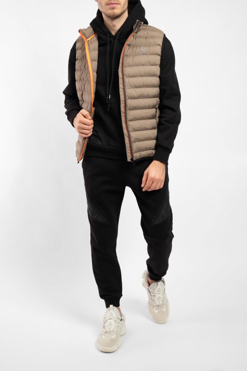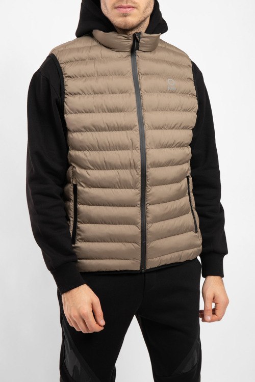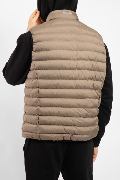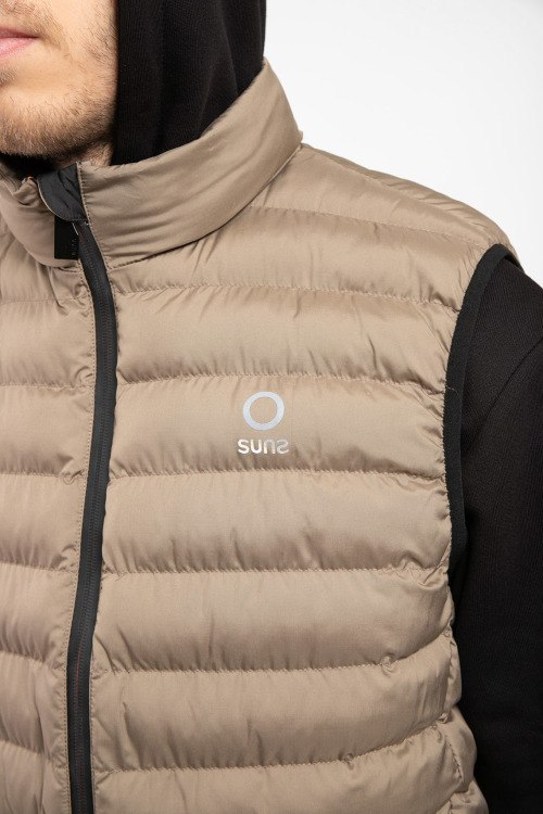 Мужской бежевый жилет из полиэстера от Suns Boards (Санс Боадс). Высокий воротник-стойка, застежка на молнию, стеганый дизайн, прорезные карманы на молнии, брендированный принт.