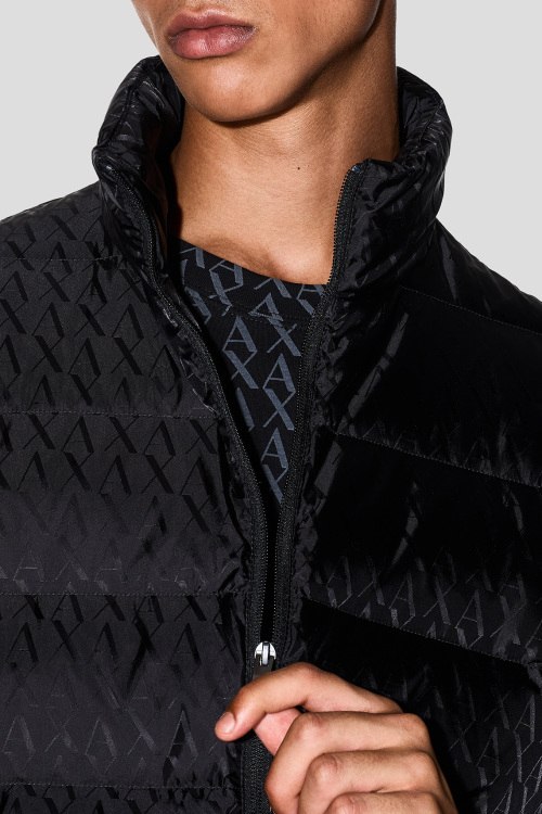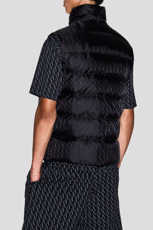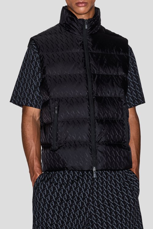 Детали: Мужской черный жилет на пуху от Armani Exchange (Армани Эксчендж). Принт с монограммой бренда по всей поверхности, стеганый дизайн, высокий воротник, боковые карманы на молнии, застежка-молния, классическая длина, наполнитель из микса пуха и пера