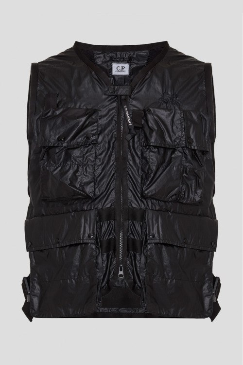 Детали: Мужской черный жилет из полиамида от C.P. Company (СиПи Компани). Застежка на молнию, четыре кармана, регулируемые ремешки, вышитый логотип. Замеры: обхват груди: для размера М – 88 см, обхват талии: для размера М – 108 см, длина изделия по среднему шву спинки от горловины: для размера М – 57 см