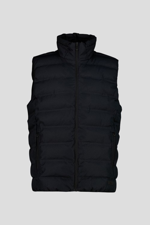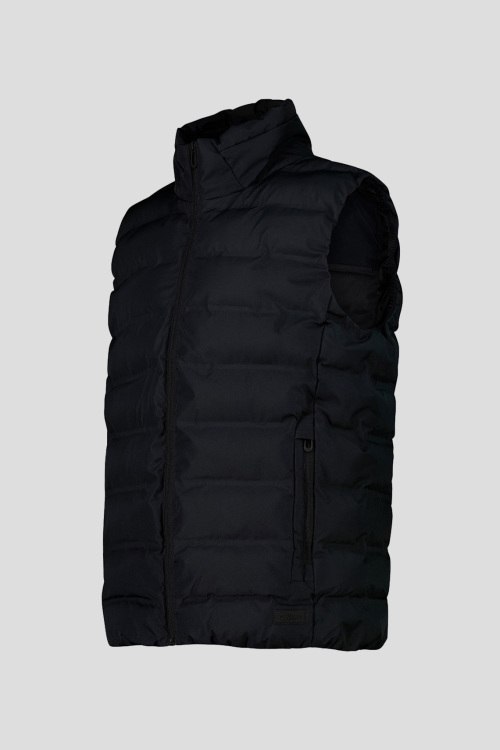 Детали: Мужской черный жилет из полиэстера от CMP (СМП). Стеганый дизайн, мембрана Clima Protect, высокий воротник-стойка, застежка на молнию, прорезные карманы, логотип бренда