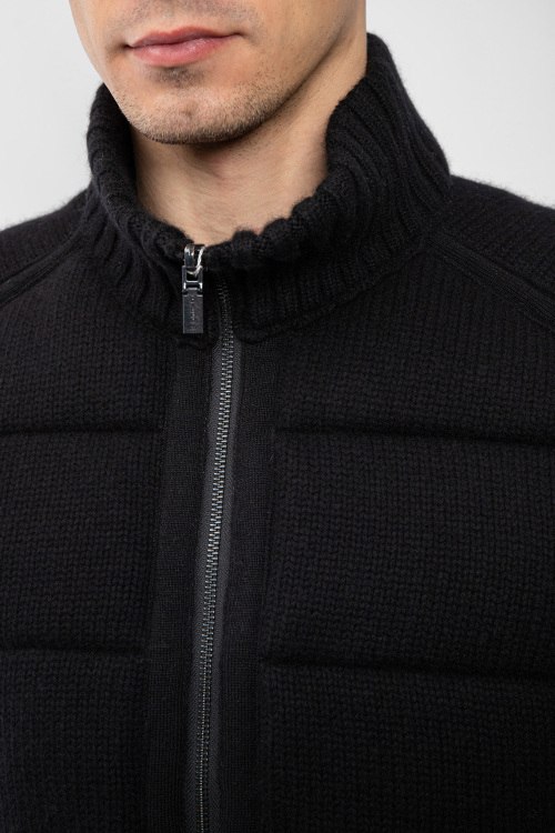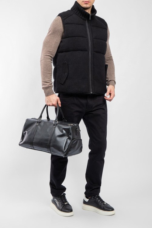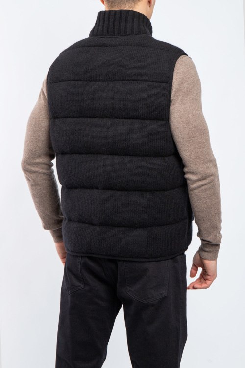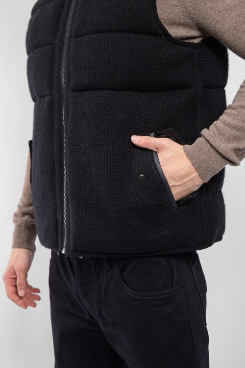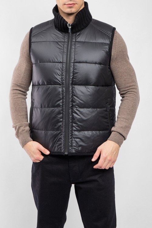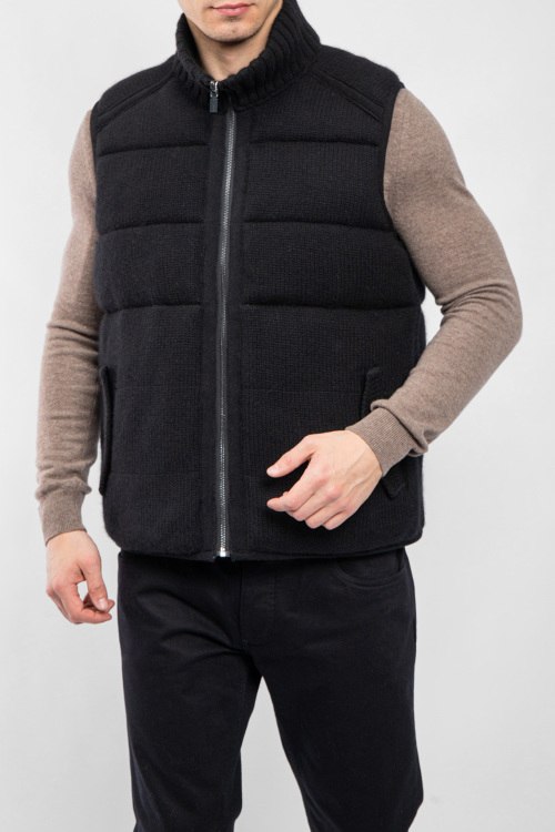 Мужской черный двухсторонний жилет на пуху от Diego M (Диего М). Одна сторона из шерсти и кашемира, вторая из полиуретана. Стеганый дизайн, высокий воротник, боковые карманы на кнопке, застежка на молнию кнопки, классическая длина, наполнитель из микса пуха и пера.