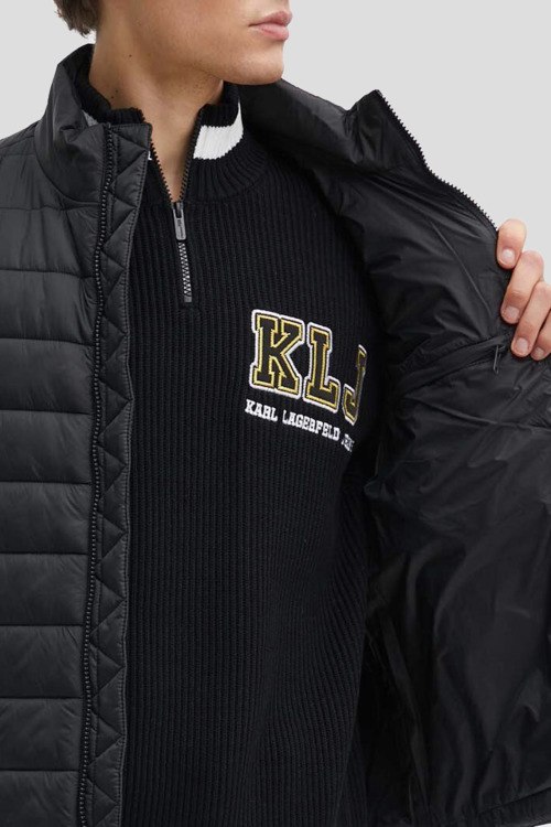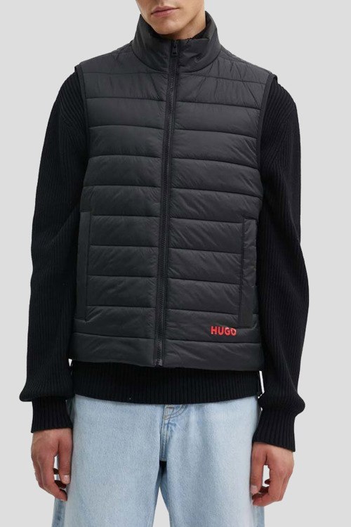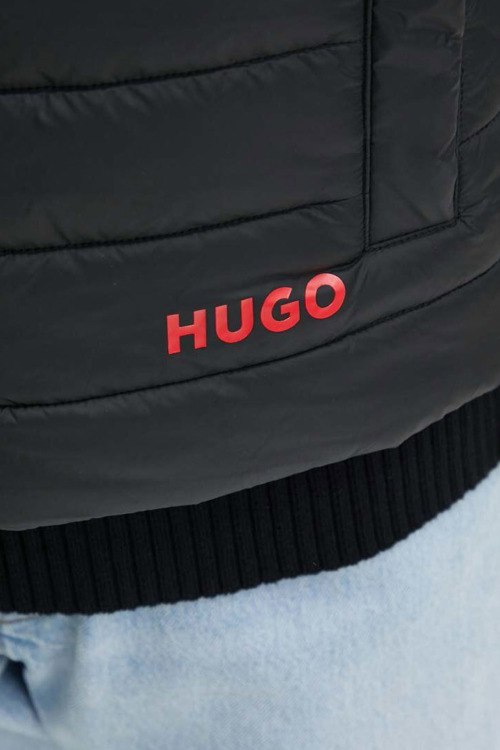 Детали: Мужской черный жилет из полиамида от Hugo by Hugo Boss (Хуго бай Хуго Босс). Стеганый дизайн, высокий воротник-стойка, застежка на молнию, прорезные карманы, утепленная модель синтепоном, принт с логотипом бренда