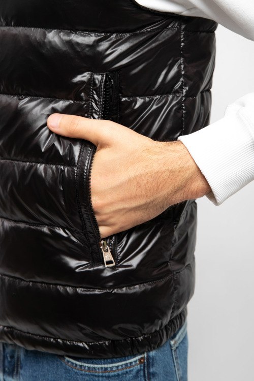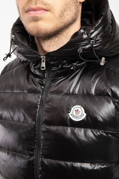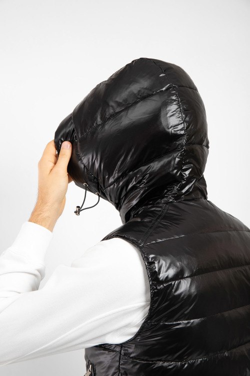 Детали: Мужской черный жилет из нейлона от Moncler (Монклер). Стеганый дизайн, высокий воротник-стойка, застежка на молнию, вшитый капюшон, патч-лого на груди, прорезные карманы на молнии, модель утепленная миксом из пуха и пера