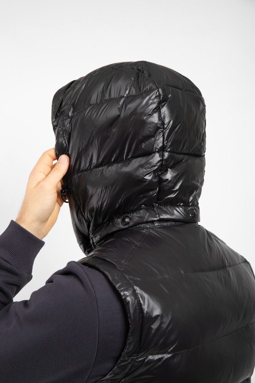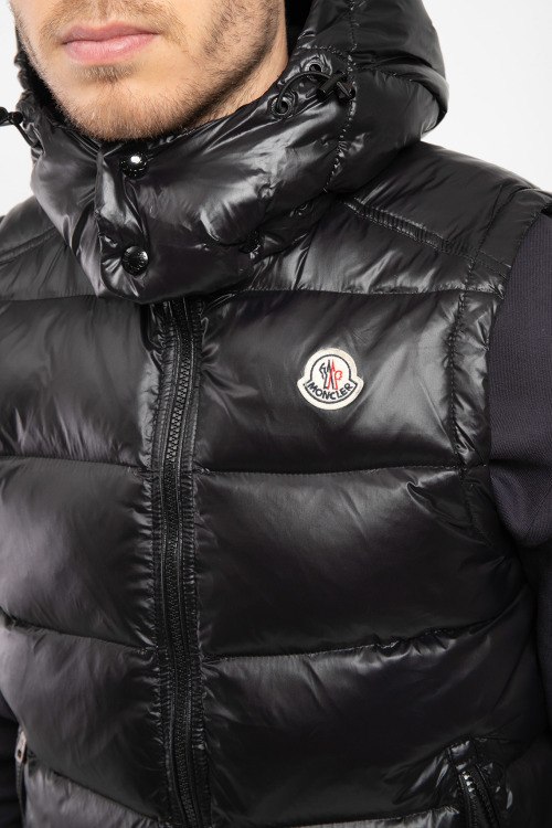 Мужской черный жилет из нейлона от Moncler (Монклер). Стеганый дизайн, высокий воротник-стойка, застежка на молнию, съемный капюшон, патч-лого на груди, прорезные карманы на молнии, модель утепленная миксом из пуха и пера