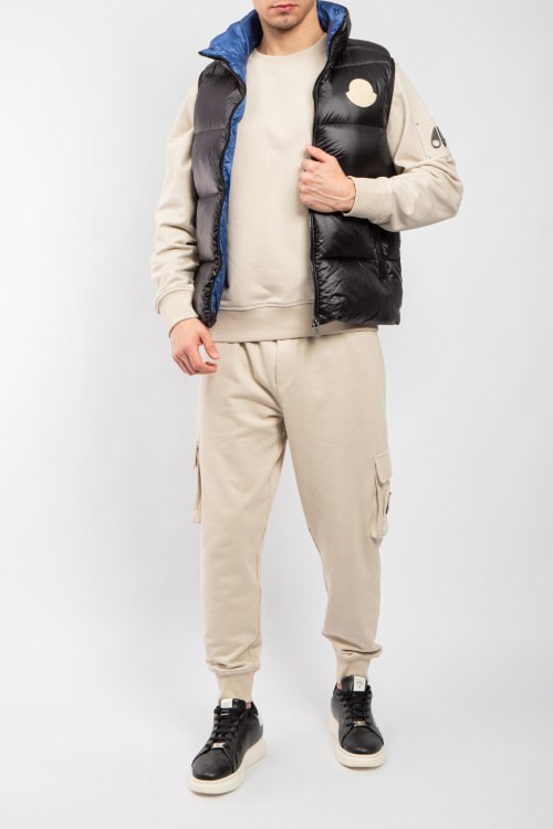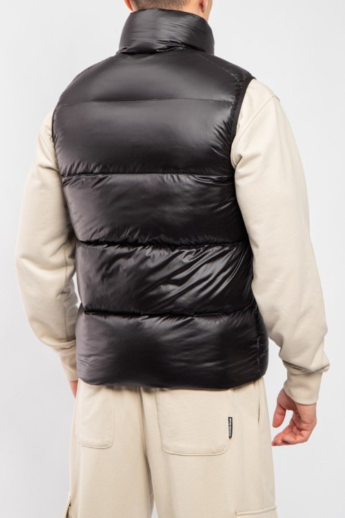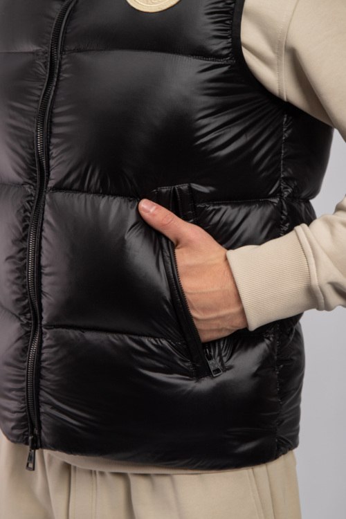 Мужской черный жилет на пуху от Moncler (Монклер). Стеганый дизайн, высокий воротник, нашивка с логотипом на груди, боковые карманы на молнии, застежка-молния, классическая длина, наполнитель из микса пуха и пера.