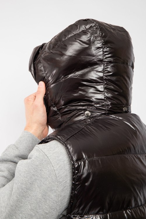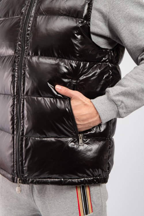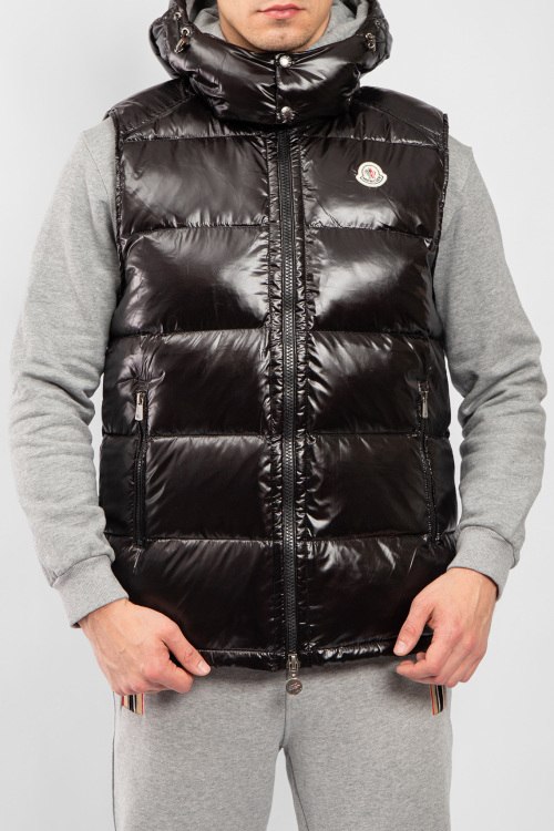 Мужской черный жилет на пуху от Moncler (Монклер). Стеганый дизайн, высокий воротник, съемный капюшон, нашивка с логотипом на груди, боковые карманы на молнии, застежка-молния, классическая длина, наполнитель из микса пуха и пера.