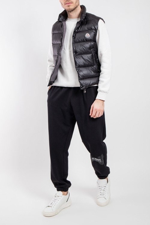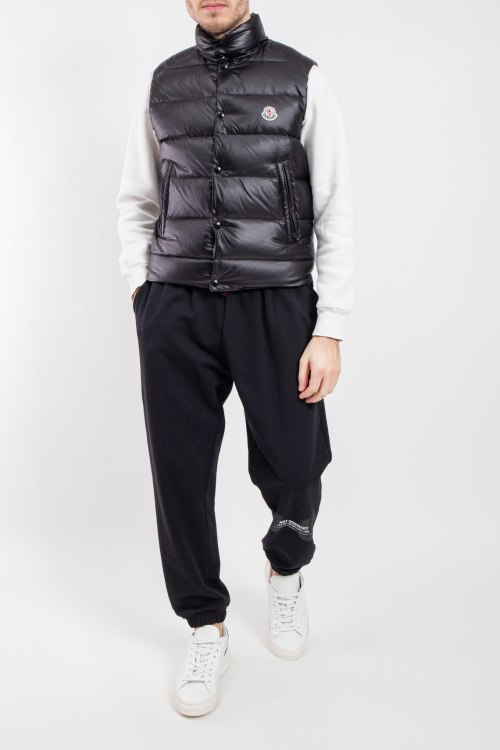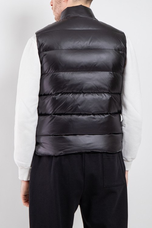 Мужской черный жилет из полиэстер от Moncler (Монклер). Стеганый дизайн, высокий воротник-стойка, застежка на молнию и кнопки, прорезные карманы на молнии, один внутренний карман, модель утепленная миксом из пуха и пера.