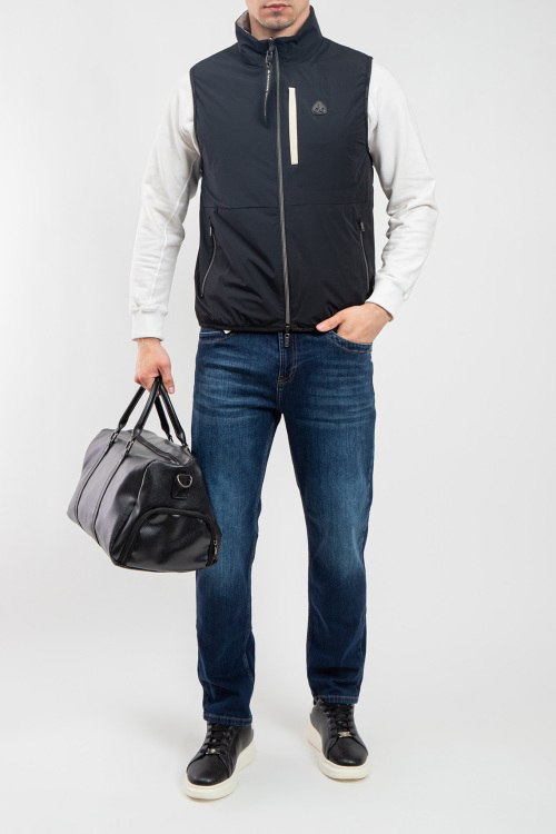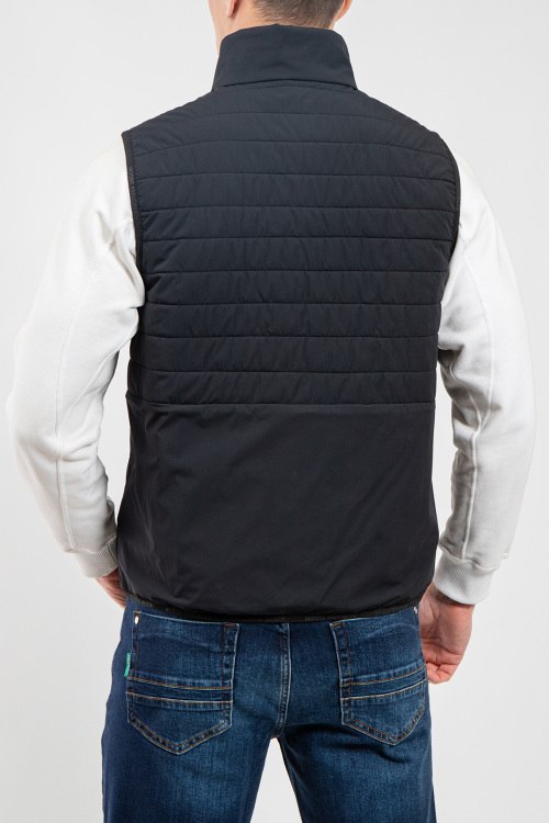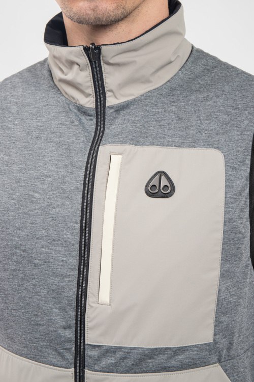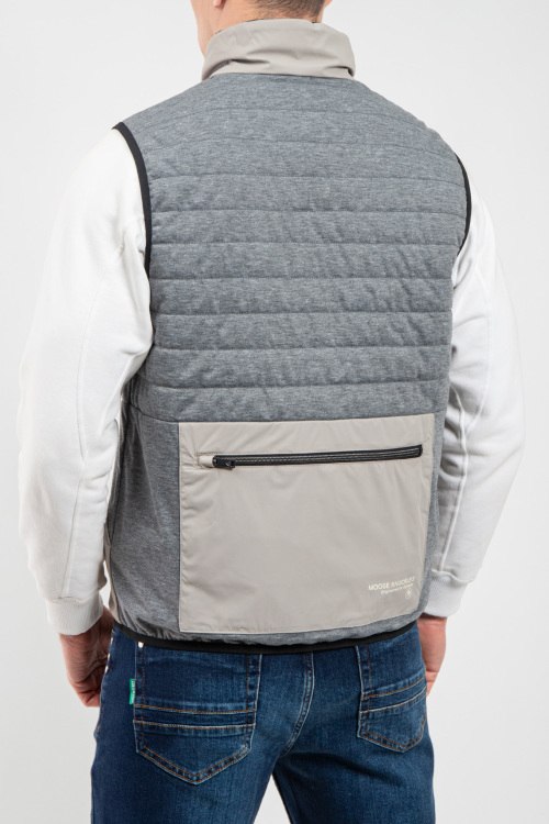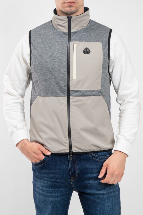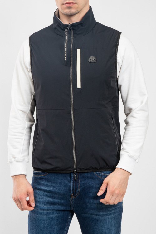 Мужской жилет из полиэстера и нейлона от Moose Knuckles (Мус Наклс). Двухсторонняя модель, высокий воротник-стойка, застежка на молнию, нагрудный и боковые карманы на молнии, стеганая спинка, одна сторона черная, другая серого цвета с бежевыми вставками, патч-лого на груди.