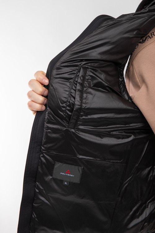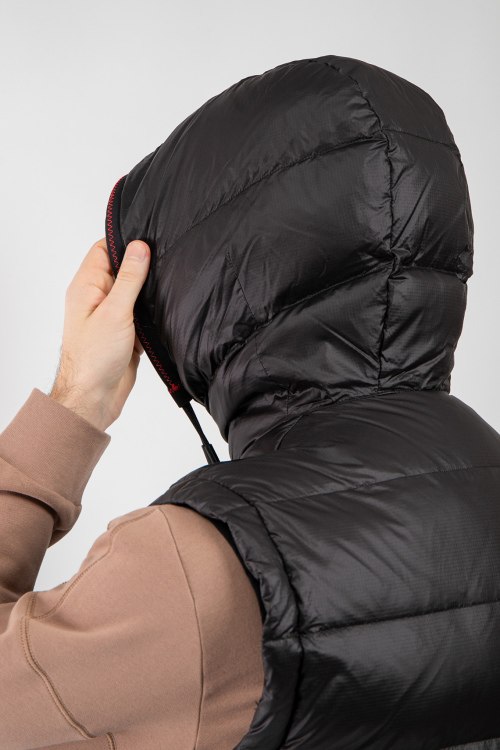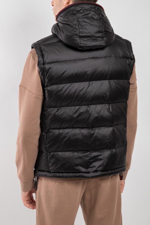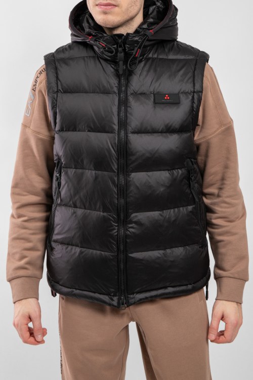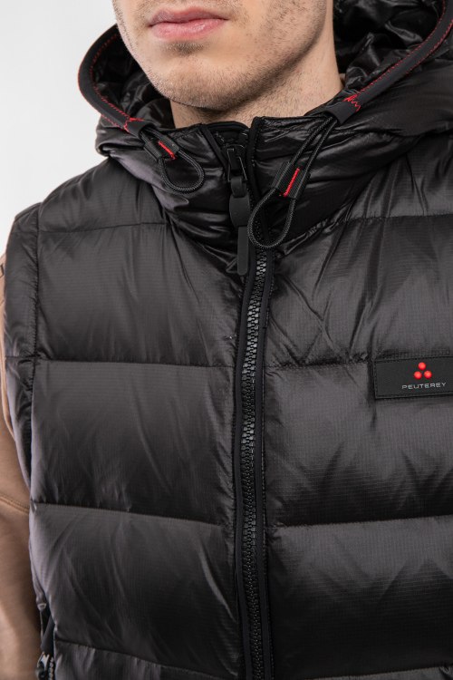 Детали: Мужской черный жилет Donom из нейлона от Peuterey (Пьютерей). Стеганый дизайн, застежка на молнию, вшитый капюшон, прорезные карманы на молнии, по бокам утяжка, модель утепленная миксом из пуха и пера, патч-лого