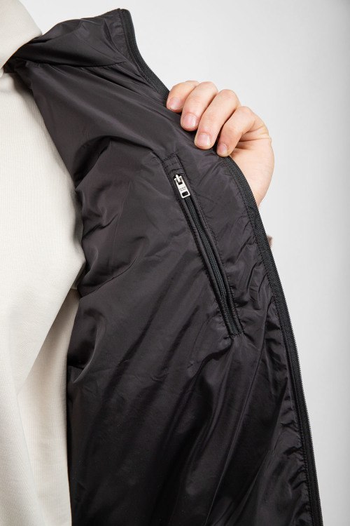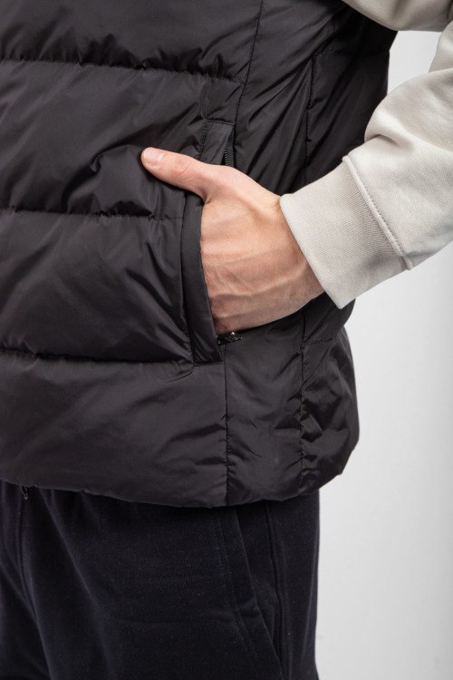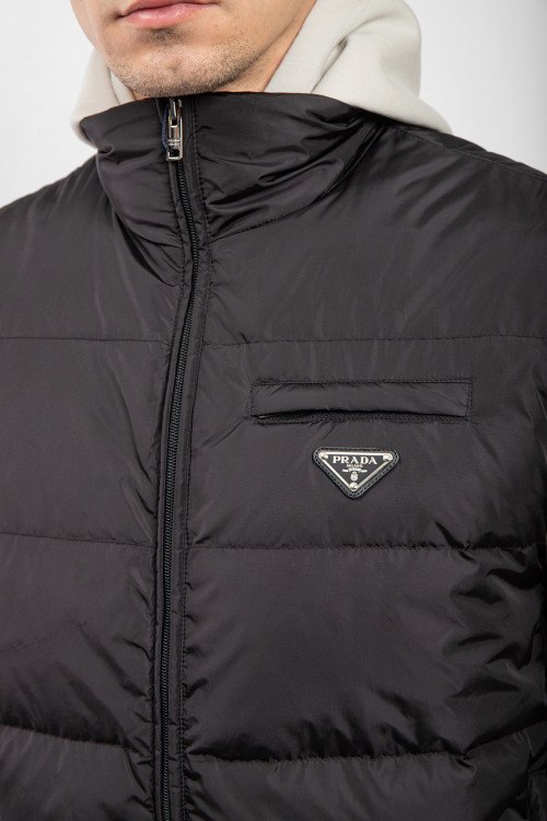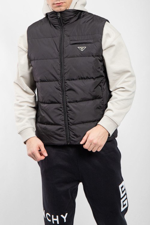 Детали: Мужской черный жилет на пуху Re-Nylon от Prada (Прада). Стеганый дизайн, высокий воротник, нашивка с логотипом на груди, три внешних кармана на молнии, застежка-молния, классическая длина, наполнитель из микса пуха и пера. Модель маломерит на 1 размер