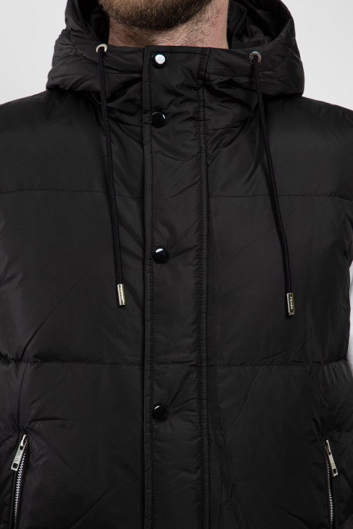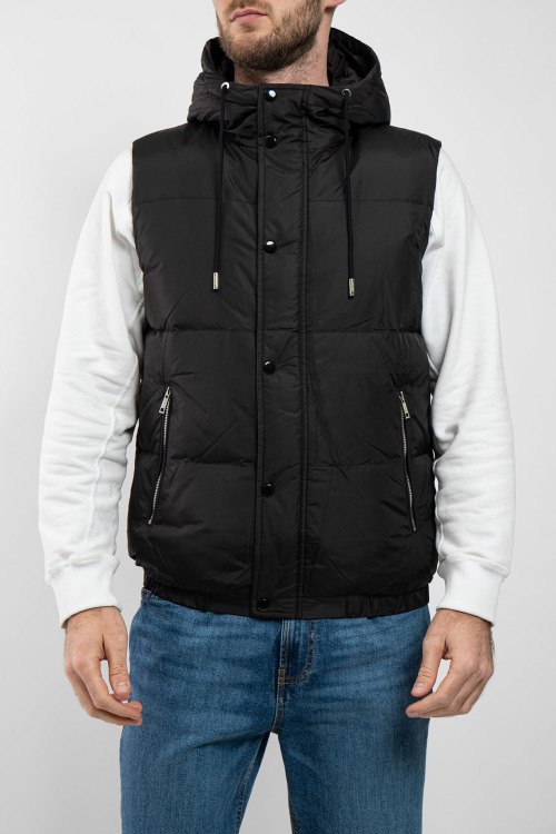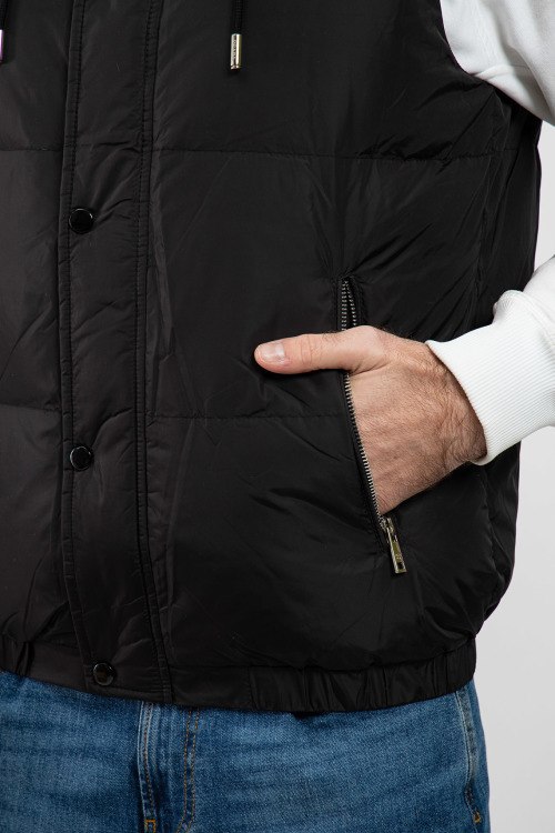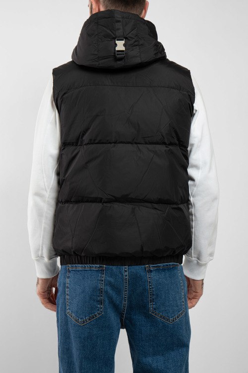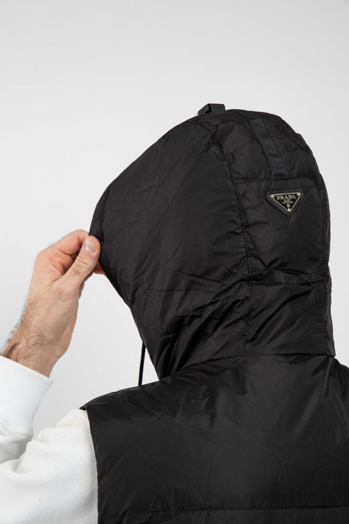 Детали: Мужской черный жилет из полиамида от Prada (Прада). Стеганый дизайн, вшитый капюшон, высокий воротник-стойка, застежка на молнию и кнопки, прорезные карманы на молнии, патч-лого, модель утепленная миксом из пуха и пера
