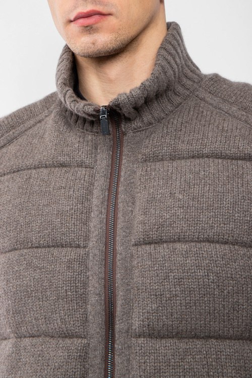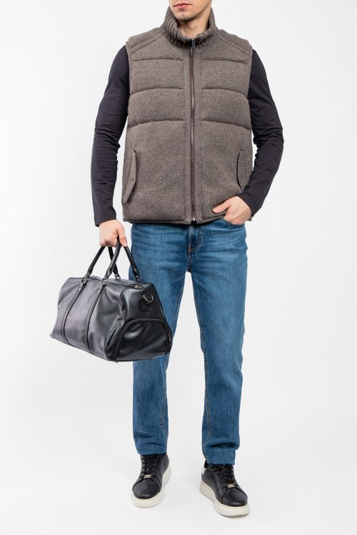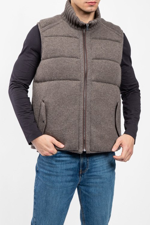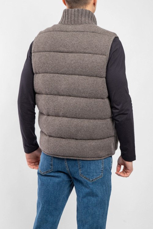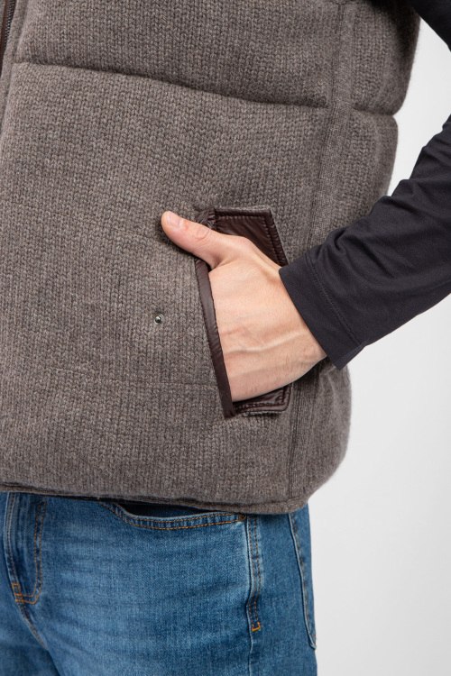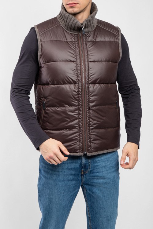 Мужской коричневый двухсторонний жилет на пуху от Diego M (Диего М). Одна сторона из шерсти и кашемира, вторая из полиуретана. Стеганый дизайн, высокий воротник, боковые карманы на кнопке, застежка на молнию кнопки, классическая длина, наполнитель из микса пуха и пера.