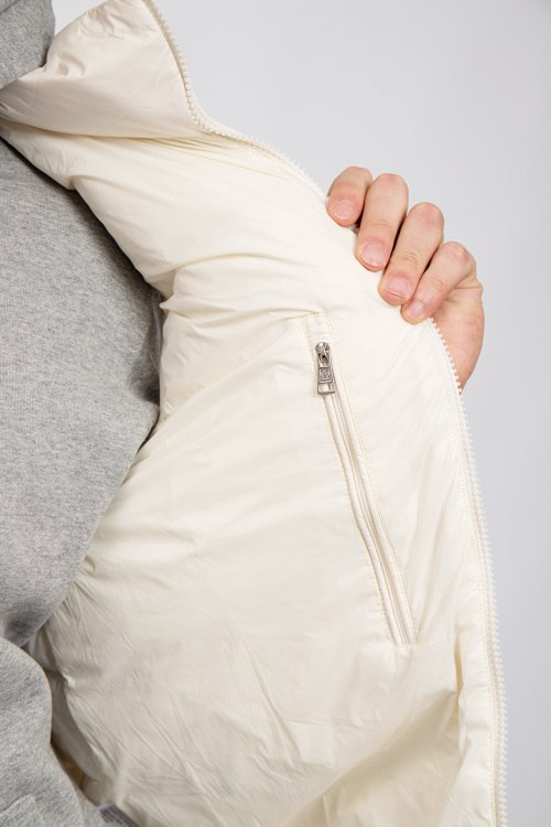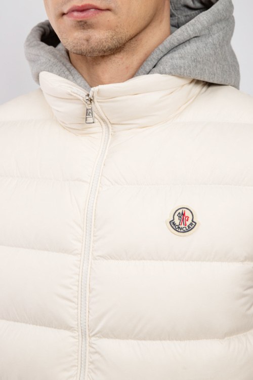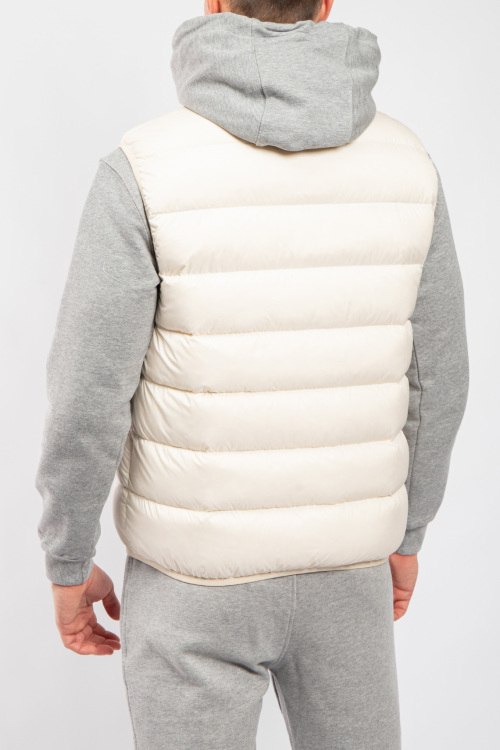 Мужской жилет на пуху молочного оттенка Contrin от Moncler (Монклер). Стеганый дизайн, высокий воротник, нашивка с логотипом на груди, боковые карманы, застежка-молния, классическая длина, наполнитель из микса пуха и пера.