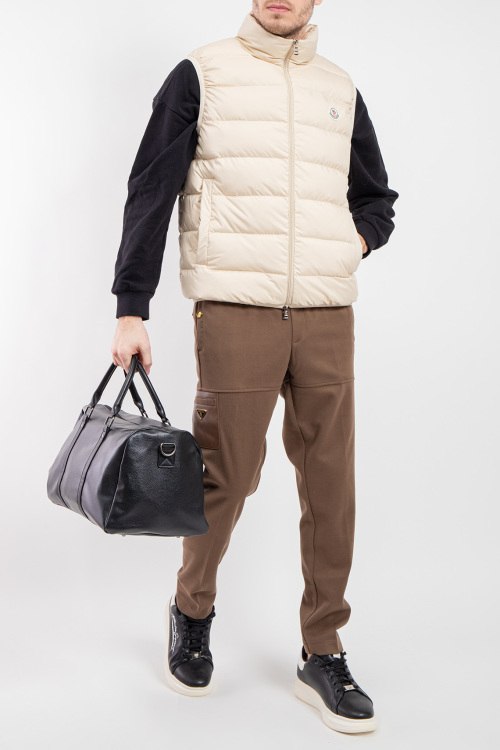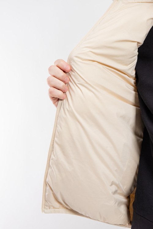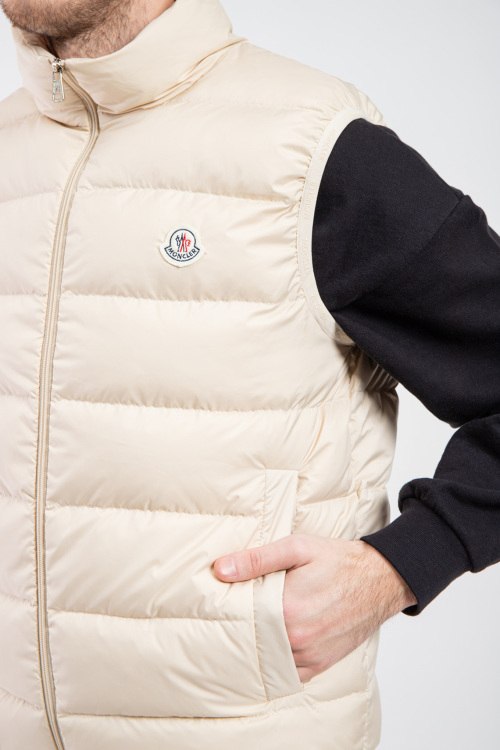 Мужской жилет молочного оттенка из полиамида от Moncler (Монклер). Стеганый дизайн, высокий воротник-стойка, застежка на молнию, прорезные карманы, один внутренний карман на молнии, патч-лог на груди, модель утепленная миксом из пуха и пера.