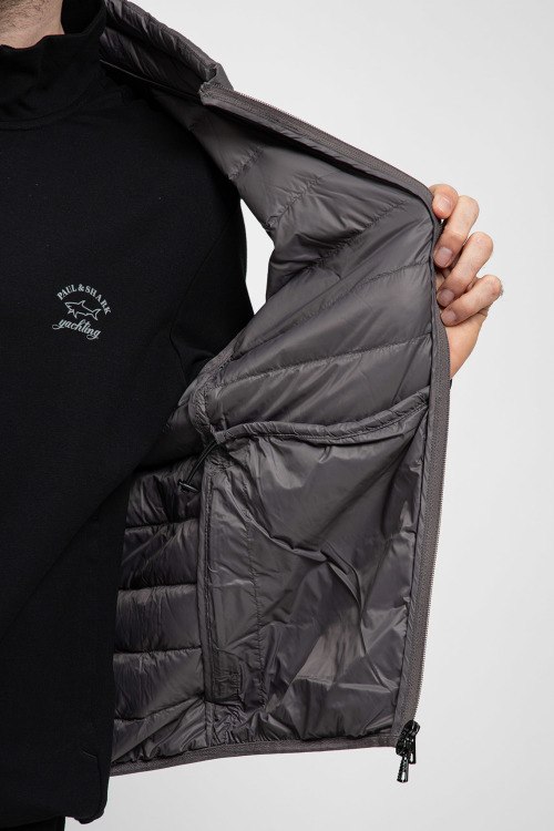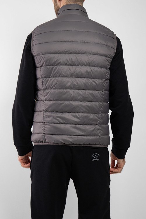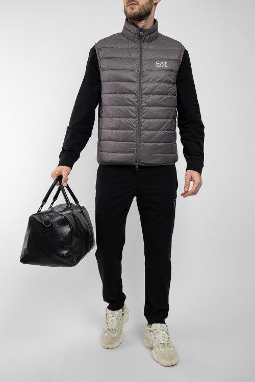 Детали: Мужской темно-серый жилет из полиамида от Armani (Армани). Стеганый дизайн, высокий воротник-стойка, застежка на молнию, прорезные карманы, логотип бренда на груди, модель утепленная миксом из пуха и пера