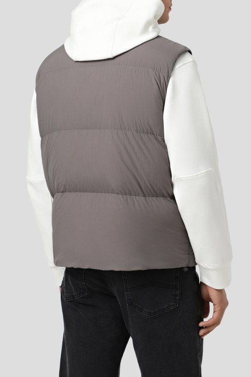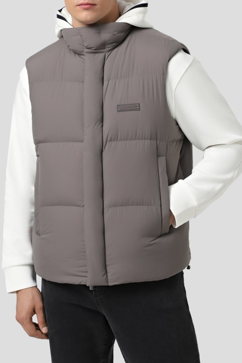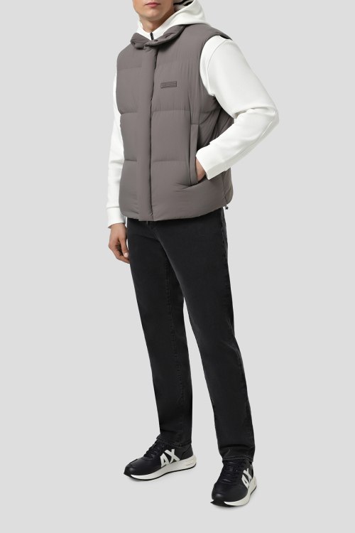 Детали: Мужской серый жилет на пуху от Armani Exchange (Армани Эксчендж). Стеганый дизайн, высокий воротник, логотип на груди, боковые карманы, застежка на молнию и кнопки, классическая длина, наполнитель из микса пуха и пера