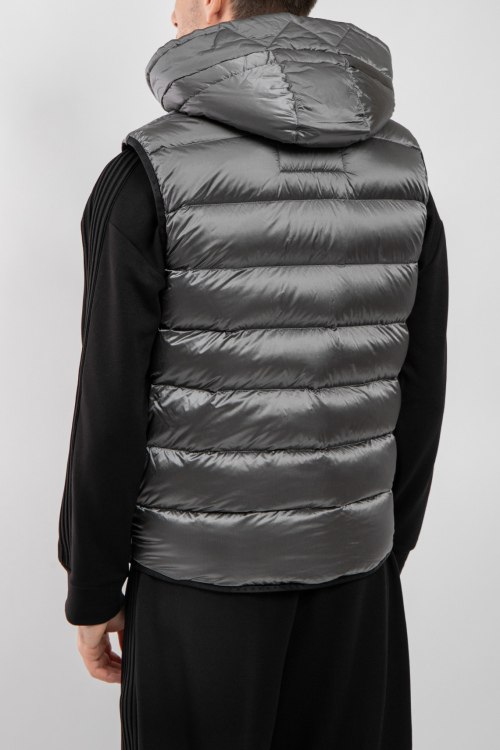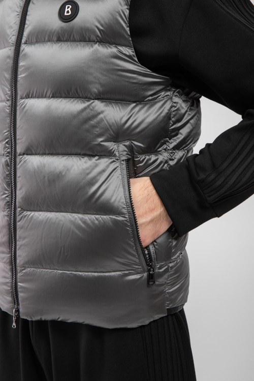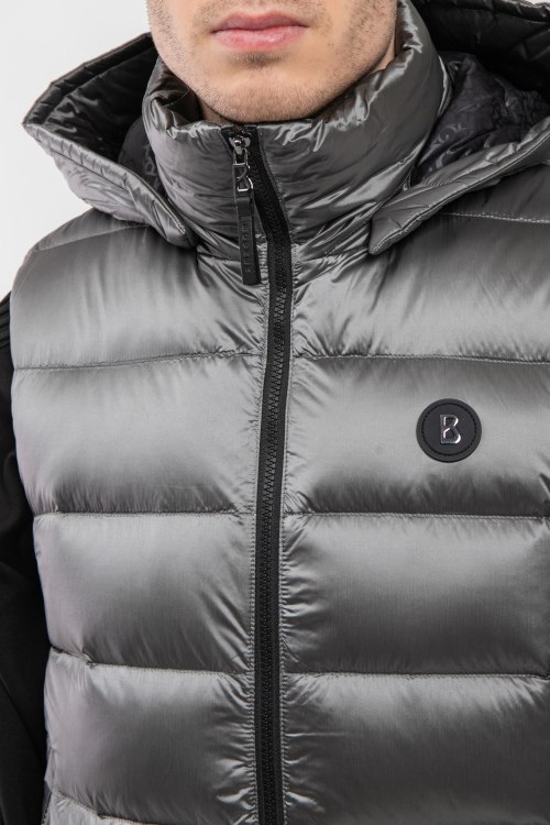 Детали: Мужской серый жилет из полиэстера от Bogner (Богнер). Стеганый дизайн, высокий воротник-стойка, застежка на молнию, съемный капюшон, прорезные карманы, патч-лого, модель утепленная модель утиным пухом