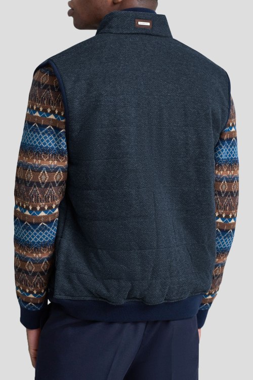 Детали: Мужской темно-синий жилет из хлопка и полиэстера от Bugatti (Бугатти). Стеганый дизайн с узором, застежка на молнию, прорезные карманы на молнии, воротник-стойка, трикотажная резинка по низу изделия
