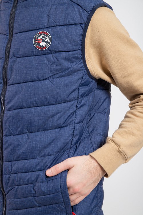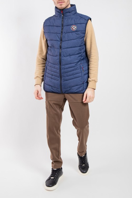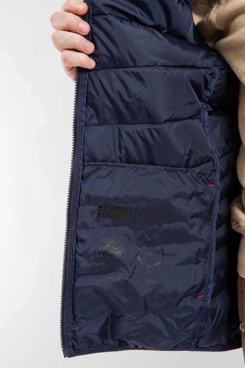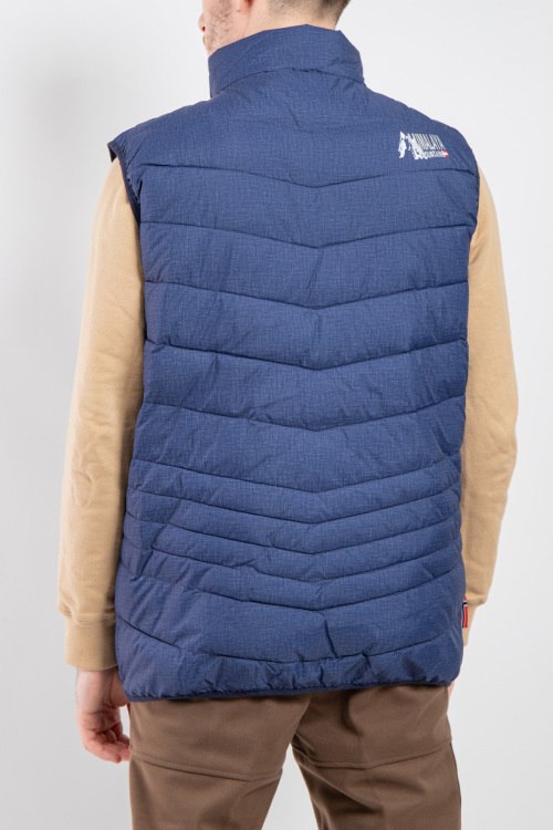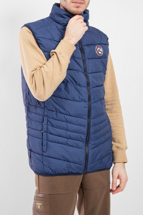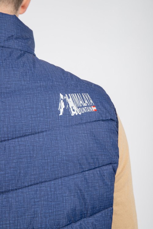 Мужской синий жилет из полиэстера от Himalaya Mountain (Гималая Маунтин). Стеганый дизайн, высокий воротник-стойка, застежка на молнию, патч-лого на груди, брендированный принт на спине, прорезные карманы, модель утепленная синтепухом.