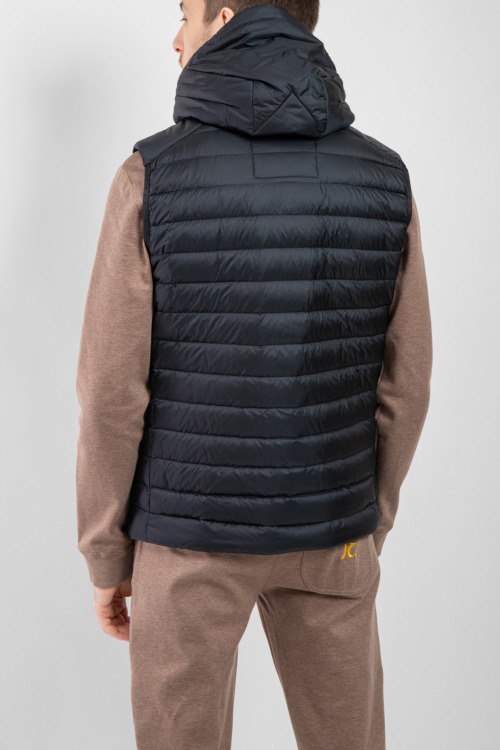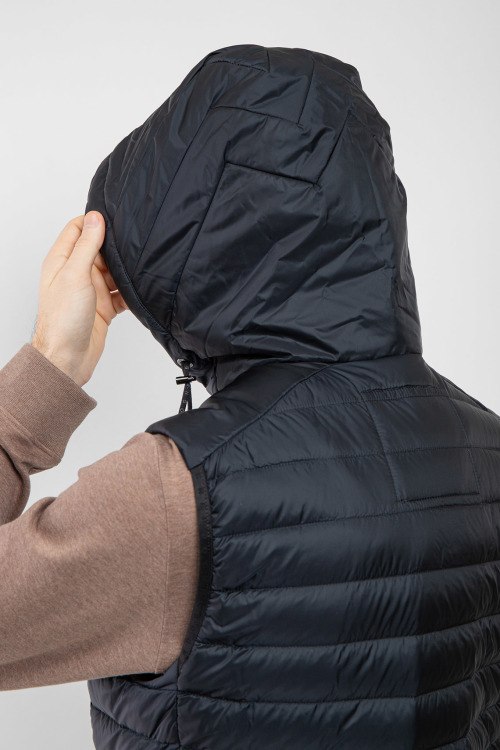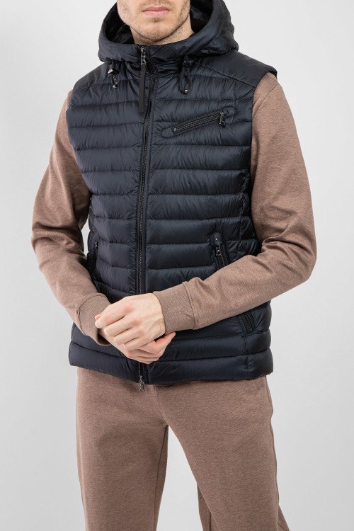 Мужской темно-синий жилет Lonne из полиэстера от Bogner (Богнер). Стеганый дизайн, застежка на молнию, вшитый капюшон, три внешних кармана на молнии, модель утепленная утиным пухом.