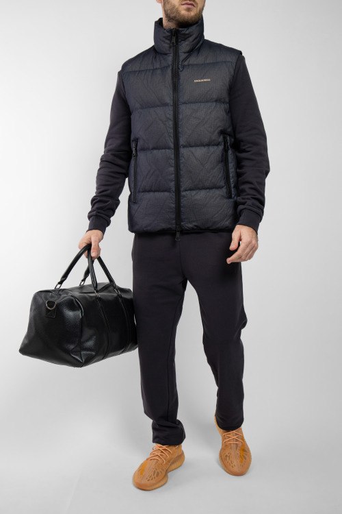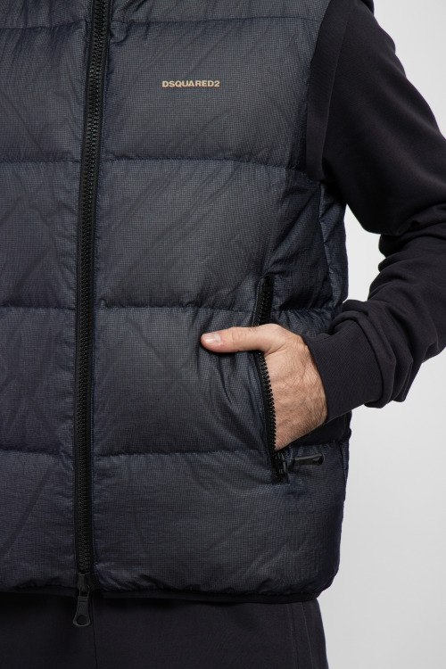 Мужской темно-серый жилет из полиэстера от Dsquared2 (Дискваред). Утепленная модель, высокий воротник-стойка, застежка на молнию, прорезные карманы на молнии, модель утепленная миксом из пуха и пера.