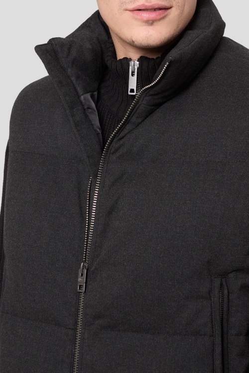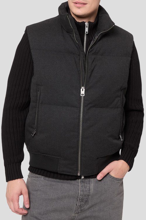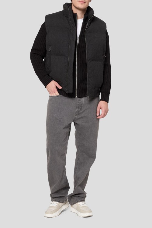 Детали: Мужской темно-серый утепленный жилет от Hugo by Hugo Boss (Хуго бай Хуго Босс). Стеганый дизайн, высокий воротник, боковые карманы на молнии, застежка-молния, трикотажный нижний край, классическая длина