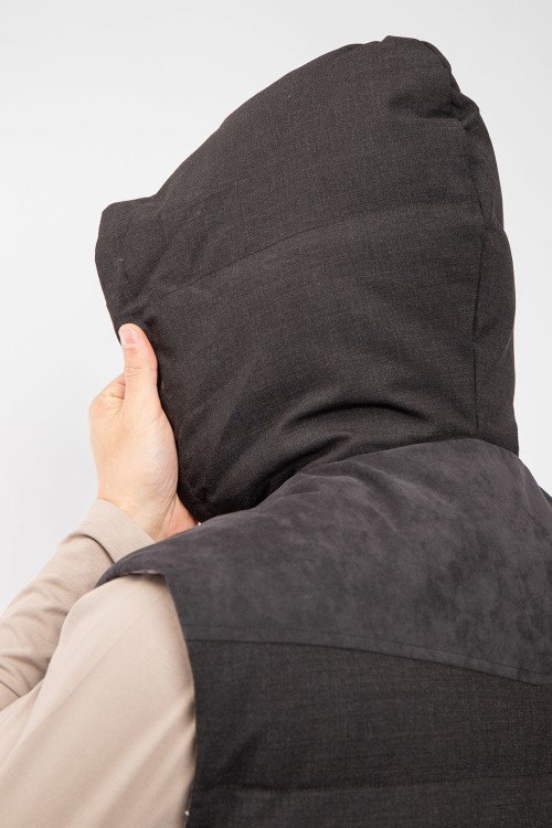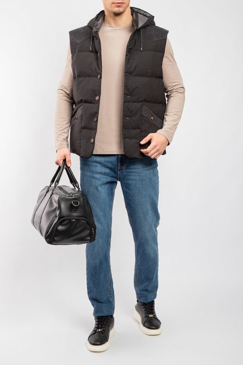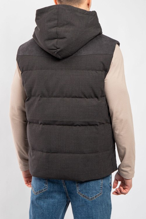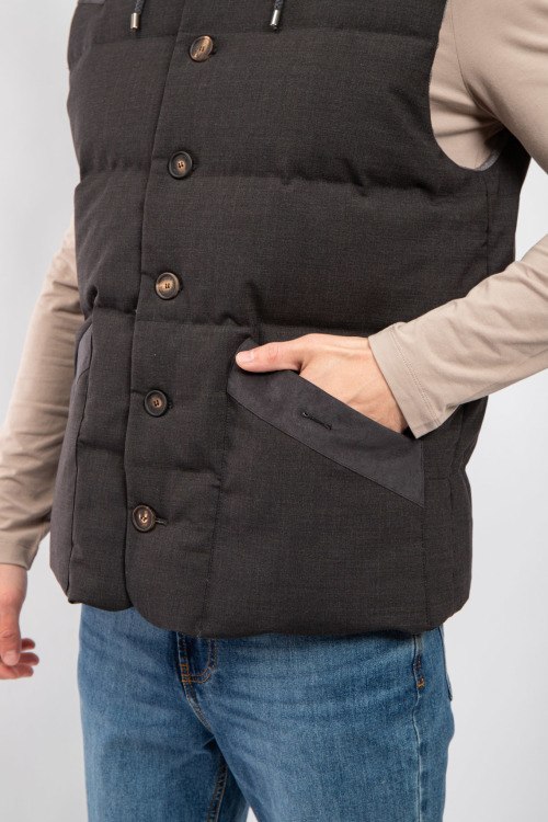 Детали: Мужской темно-серый шерстяной жилет на пуху от Panicale Cashmere (Паникале Кашемир). Стеганый дизайн, вшитый капюшон, высокий воротник, передние карманы, застежка на пуговицы, классическая длина, наполнитель из микса пуха и пера. Размер вещи на фото: 54