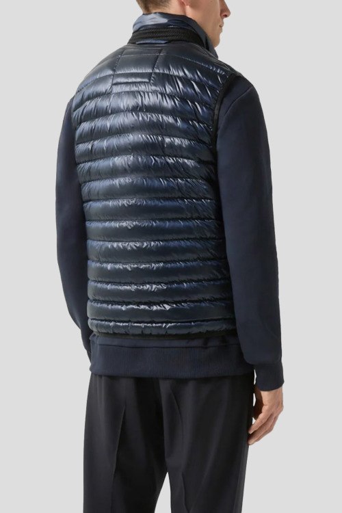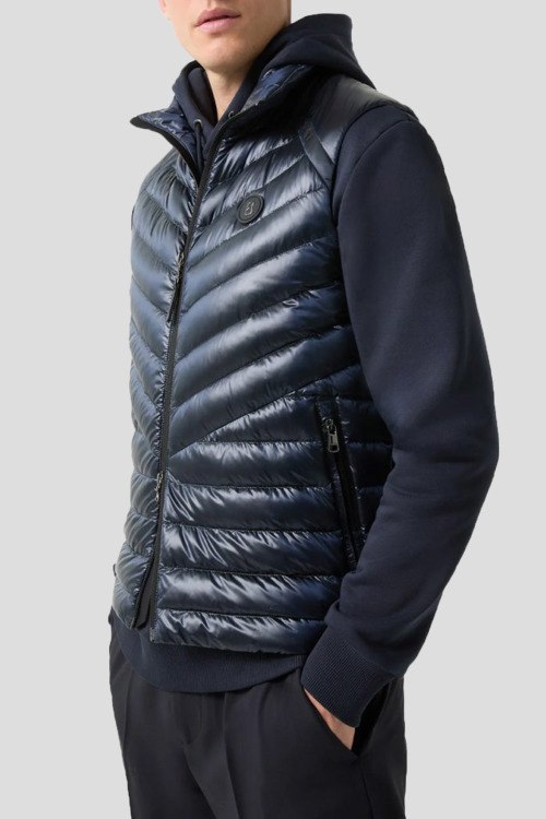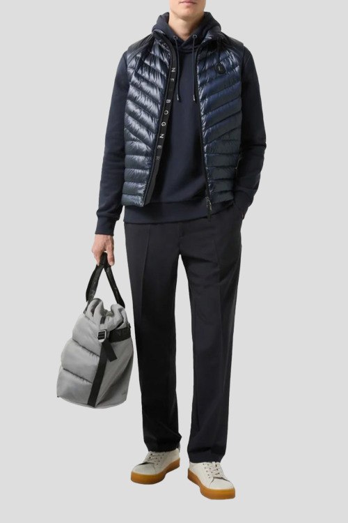 Детали: Мужской темно-синий жилет на пуху Lasse от Bogner (Богнер). Стеганый дизайн, высокий воротник, нашивка с логотипом на груди, боковые карманы на молнии, застежка-молния, пуховый наполнитель, классическая длина