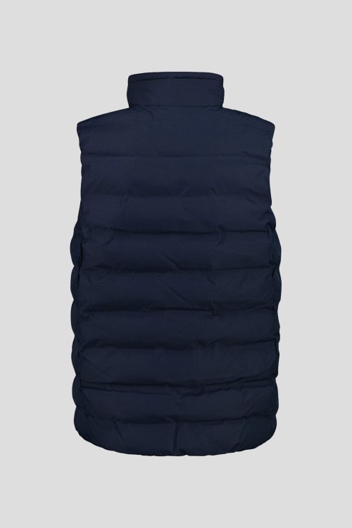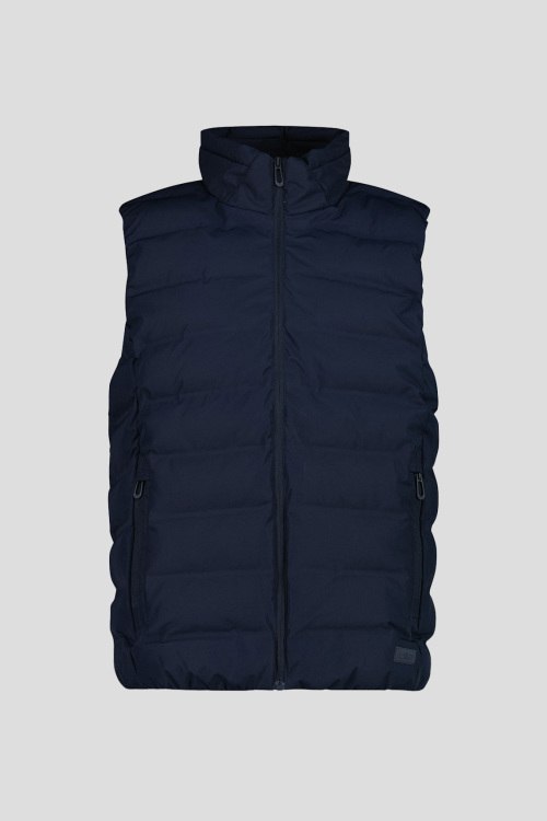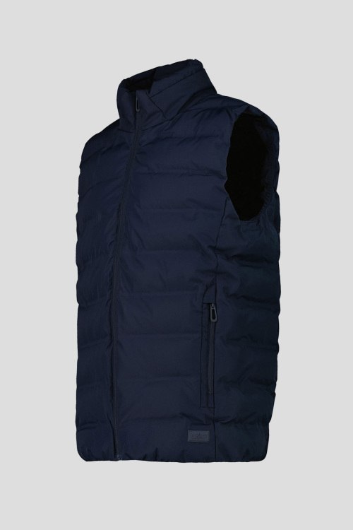Детали: Мужской темно-синий жилет из полиэстера от CMP (СМП). Стеганый дизайн, мембрана Clima Protect, высокий воротник-стойка, застежка на молнию, прорезные карманы, логотип бренда