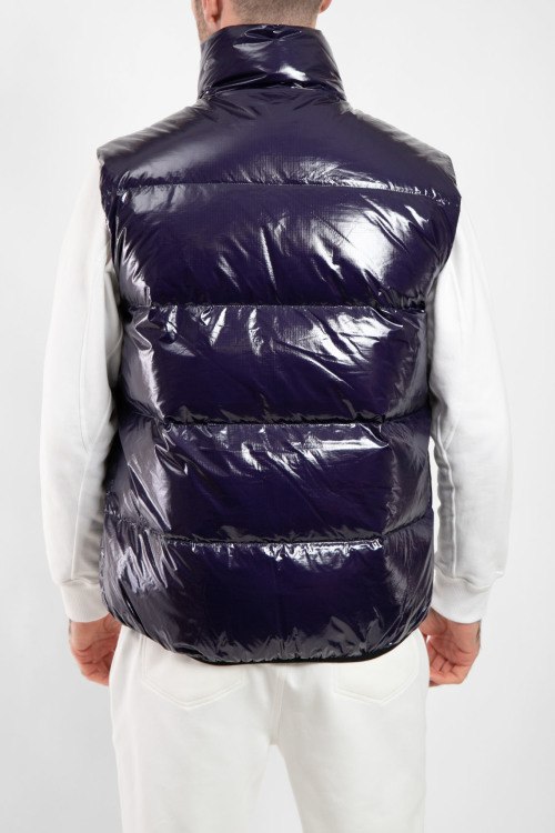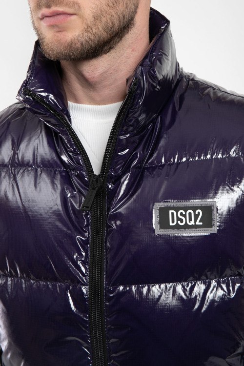 Мужской темно-синий жилет на пуху DSQ2 от Dsquared2 (Дискваред). Стеганый дизайн, высокий воротник, нашивка с логотипом на груди, боковые карманы на молнии, застежка-молния, классическая длина, наполнитель из микса пуха и пера.
