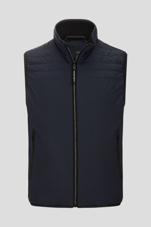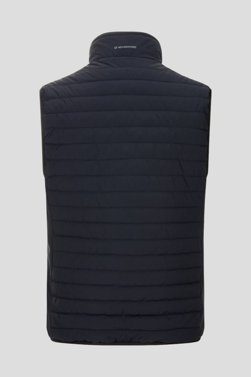 Детали: Мужской темно-синий жилет из полиамида и эластана от Milestone (Майлстоун). Стеганая спинка, высокий воротник-стойка, застежка ан молнию, прорезные карманы на молнии