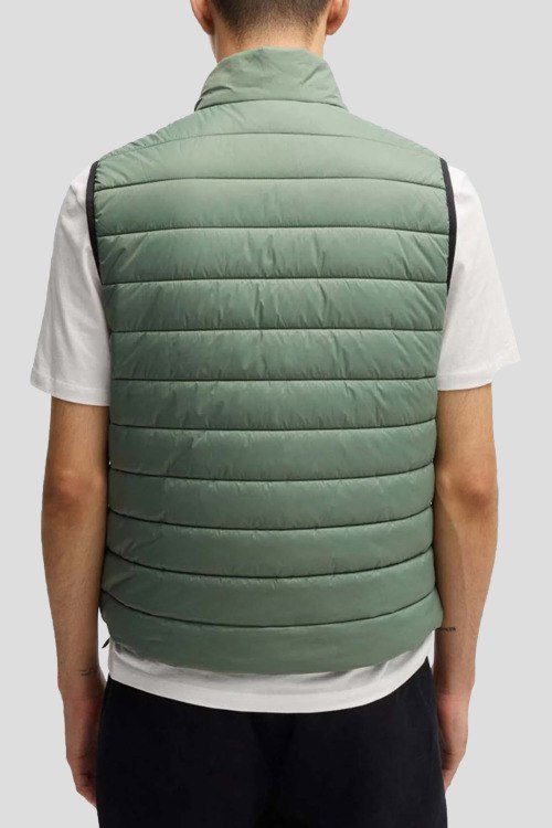 Мужской оливковый утепленный жилет Brentino2431 от Hugo Boss (Хуго Босс). Стеганый дизайн, принт с логотипом, высокий воротник, боковые карманы, застежка-молния, классическая длина