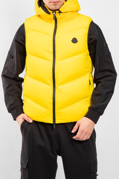 Мужской желтый жилет на пуху с капюшоном Sumido от Moncler (Монклер). Стеганый дизайн, высокий воротник, вшитый капюшон, нашивка с логотипом на груди, боковые карманы на молнии, застежка-молния, классическая длина, наполнитель из микса пуха и пера.