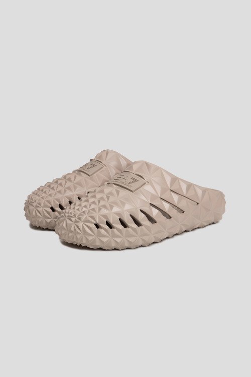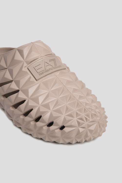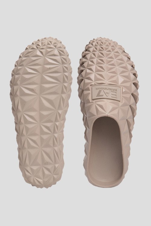 Детали: Мужские бежевые слайдеры от EA7 Emporio Armani (ЕА7 Эмпорио Армани). Закругленный носок закрытый, патч-лого, фактурная поверхности, плоская подошва