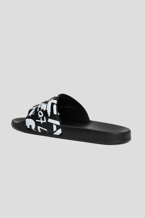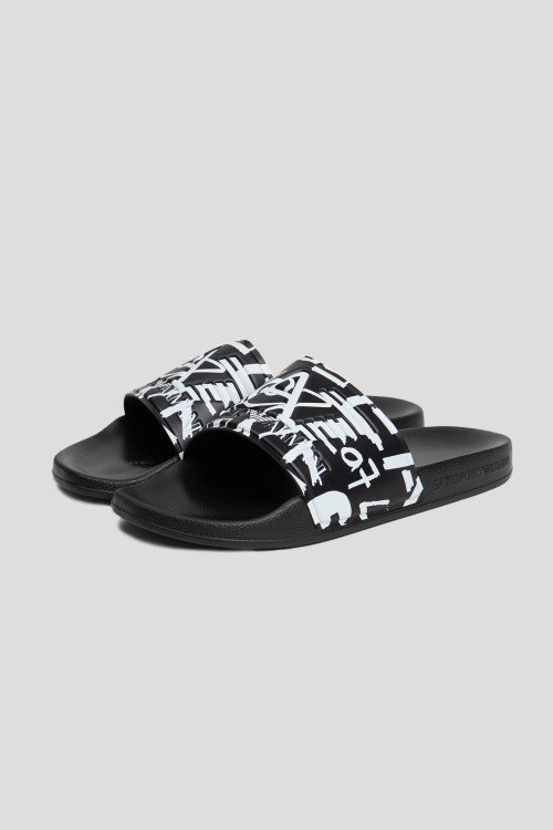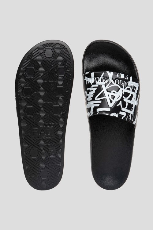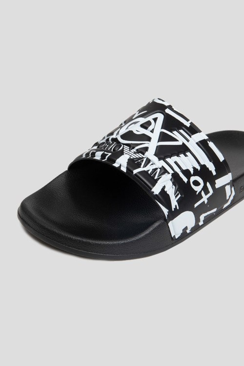 Детали: Мужские черные слайдеры из ПВХ от EA7 Emporio Armani (ЕА7 Эмпорио Армани). Закругленный носок, анатомическая стелька, широкий ремешок с брендированным принтом