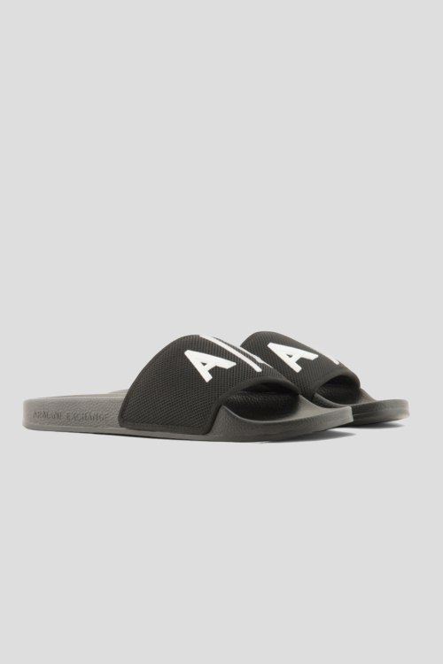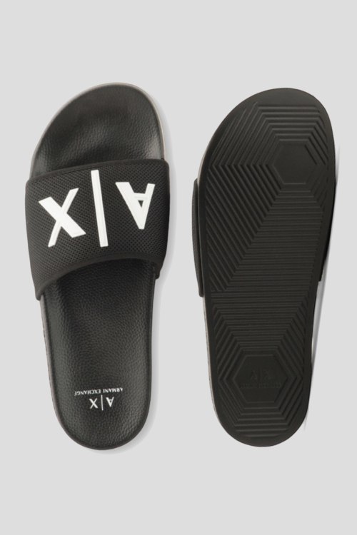 Детали: Мужские черные слайдеры от Armani Exchange (Армани Эксчендж). Широкий ремешок с логотипом, закругленный носок, анатомическая стелька
