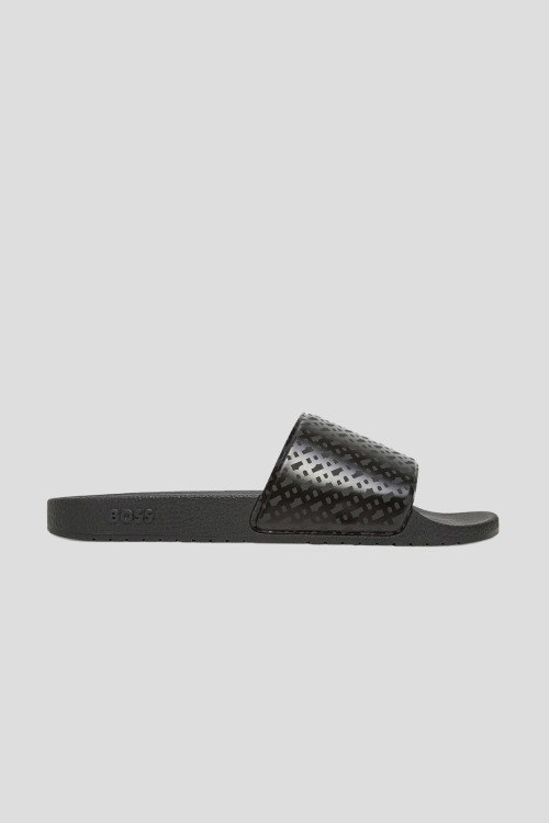 Детали: Мужские черные слайдеры Aryeh от Hugo Boss (Хуго Босс). Широкий ремешок с монограммой, закругленный носок, анатомическая стелька