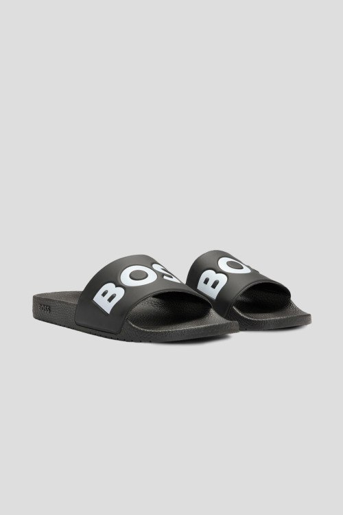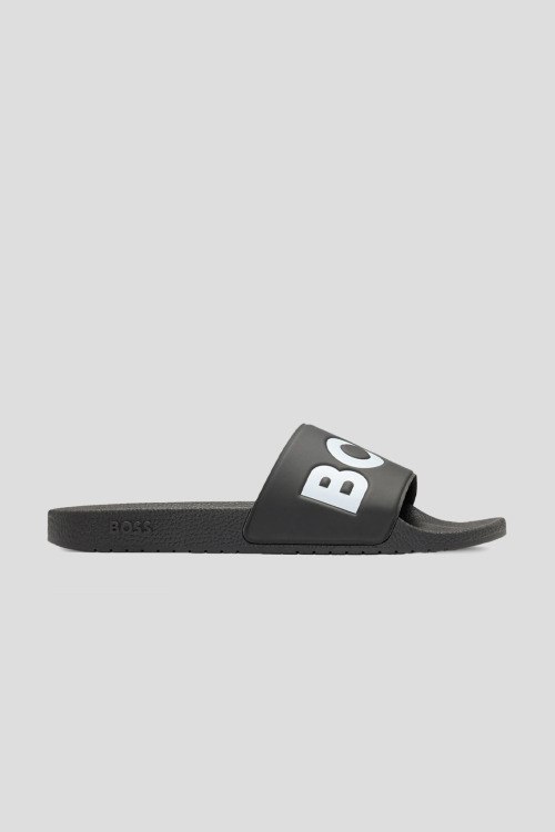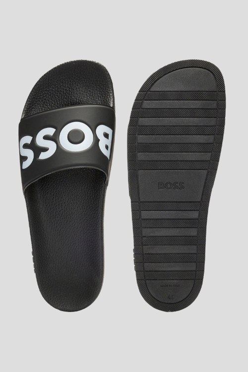 Детали: Мужские черные слайдеры Aryeh от Hugo Boss (Хуго Босс). Широкий ремешок с логотипом, закругленный носок, анатомическая стелька