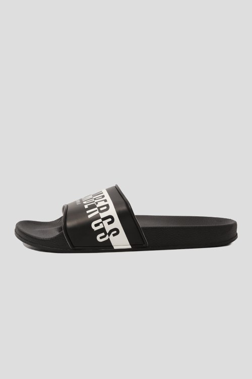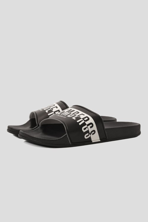 Детали: Мужские черные слайдеры из резины от Dirk Bikkembergs (Дирк Биккембергс). Закругленный носок, широкий ремешок с принтом в виде логотипа бренда, анатомическая стелька с лого