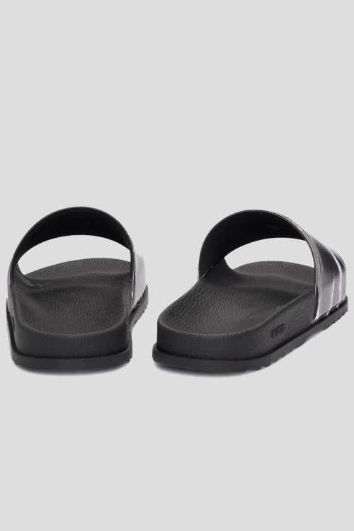 Детали: Мужские черные слайдеры из резины от Hugo by Hugo Boss (Хуго бай Хуго Босс). Закругленный носок, широкий ремешок с узором, патч-лого, анатомическая стелька