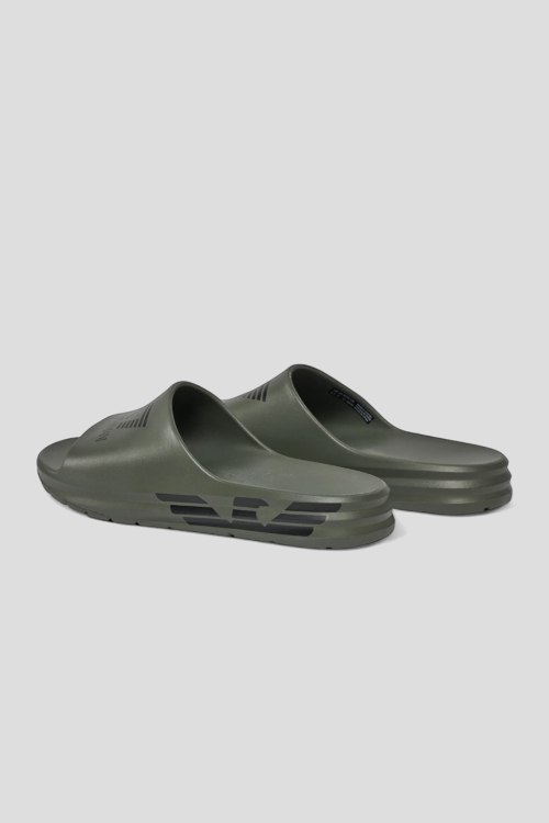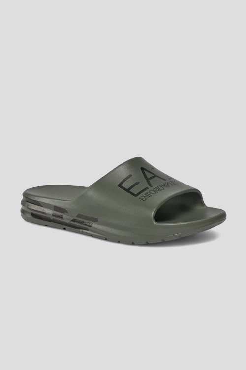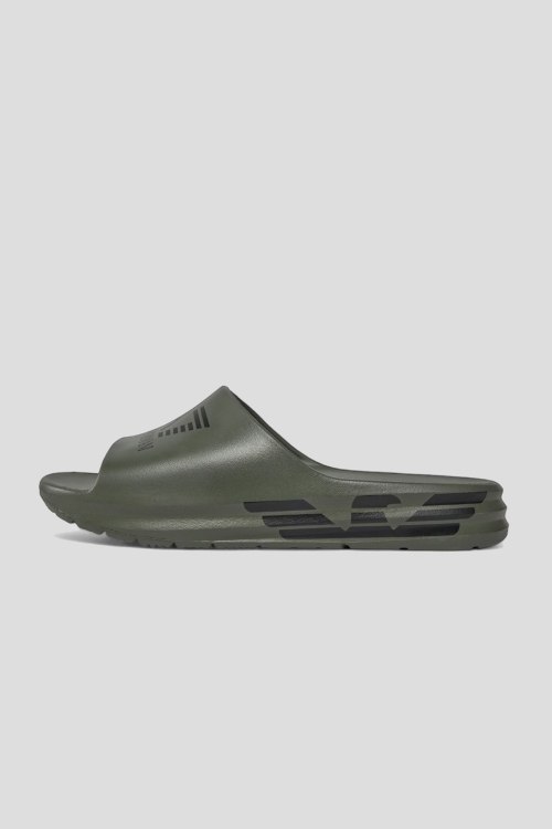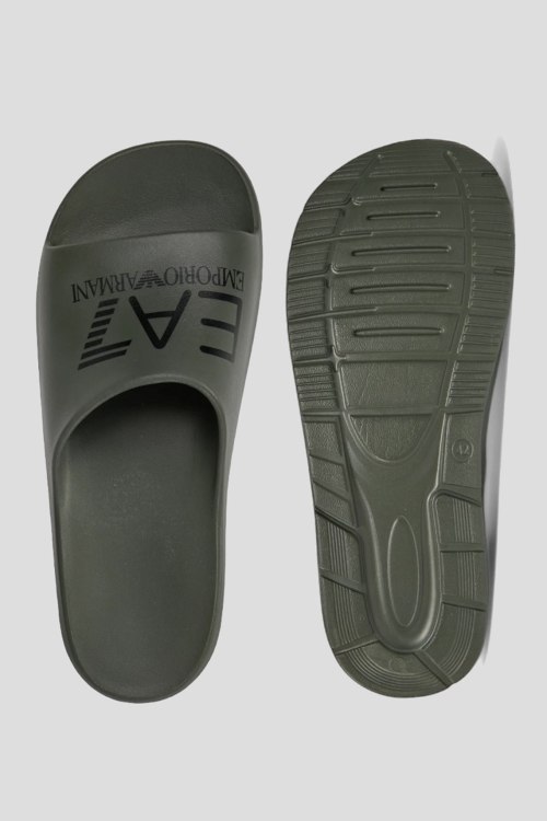 Детали: Мужские слайдеры цвета хаки от EA7 Emporio Armani (ЕА7 Эмпорио Армани). Широкий ремешок с логотипом, закругленный носок, анатомическая стелька