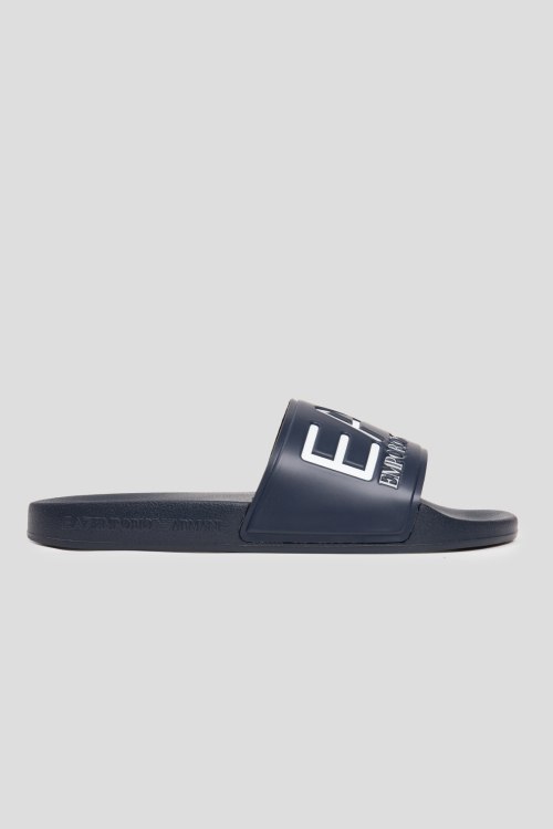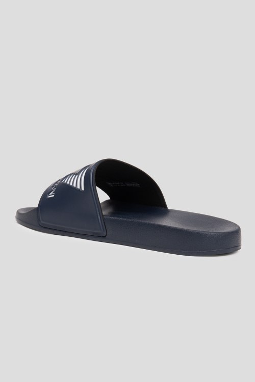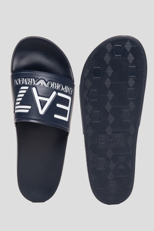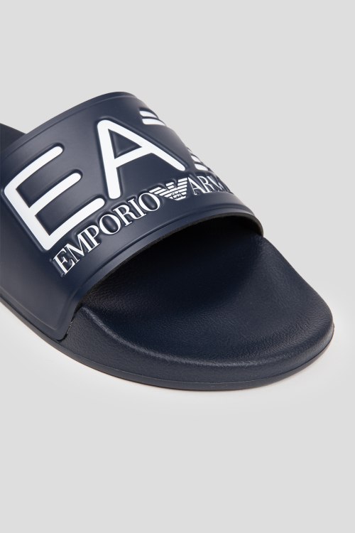 Детали: Мужские темно-синие слайдеры от EA7 Emporio Armani (ЕА7 Эмпорио Армани). Широкий ремешок с логотипом, закругленный носок, анатомическая стелька